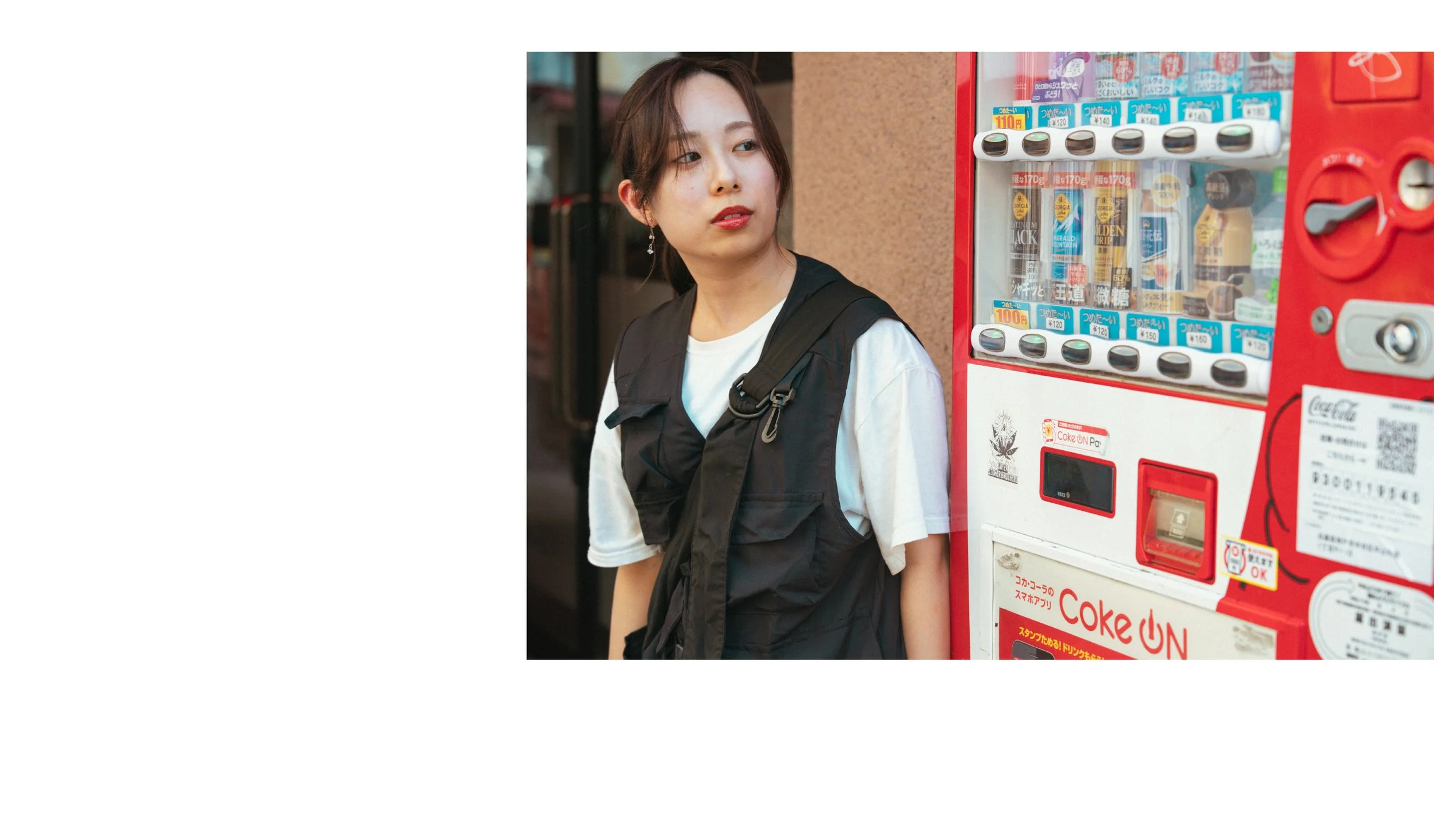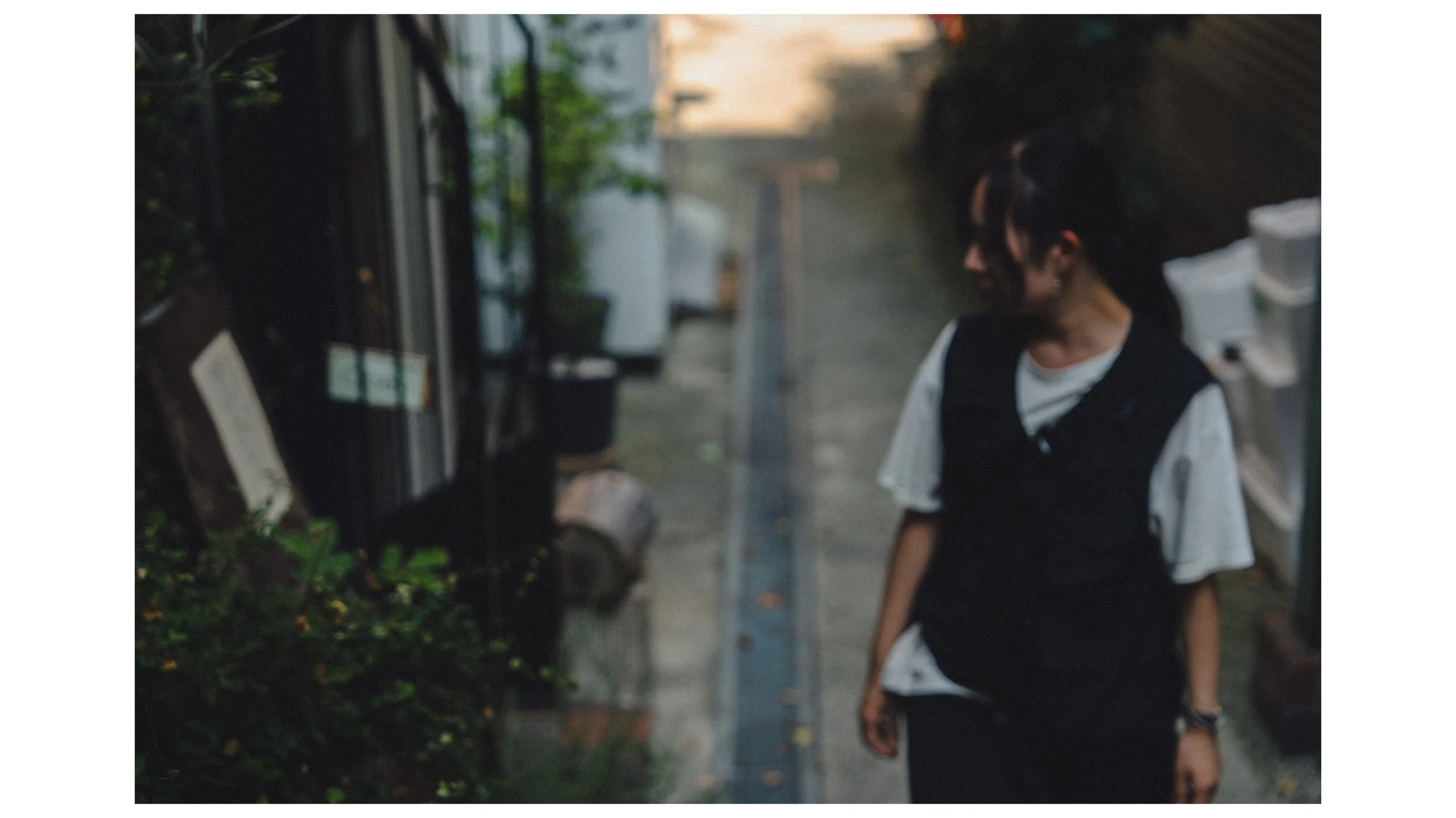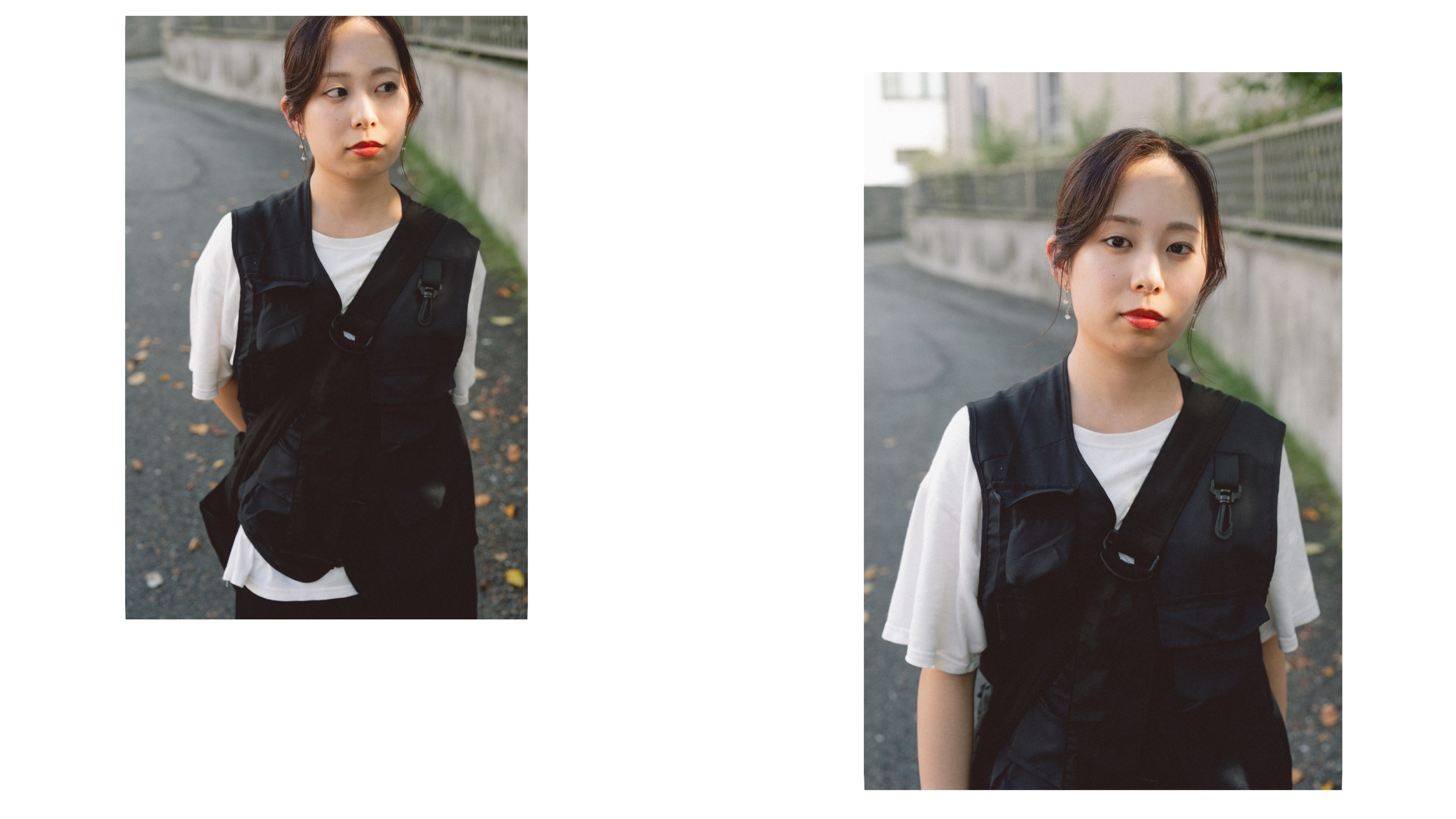暗い背景に女性が立っている。彼女は白いTシャツに黒いベストを着ており、ショルダーバッグを持っている。