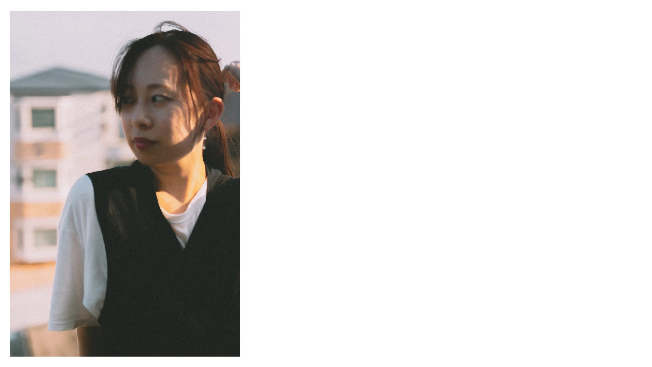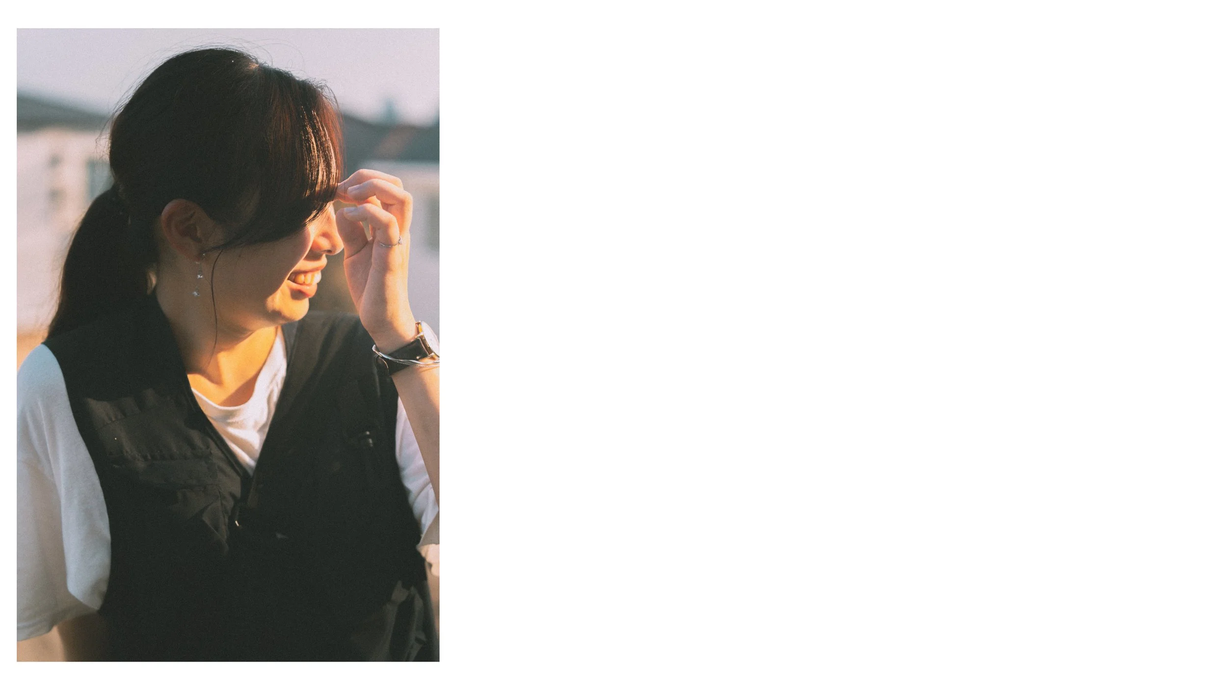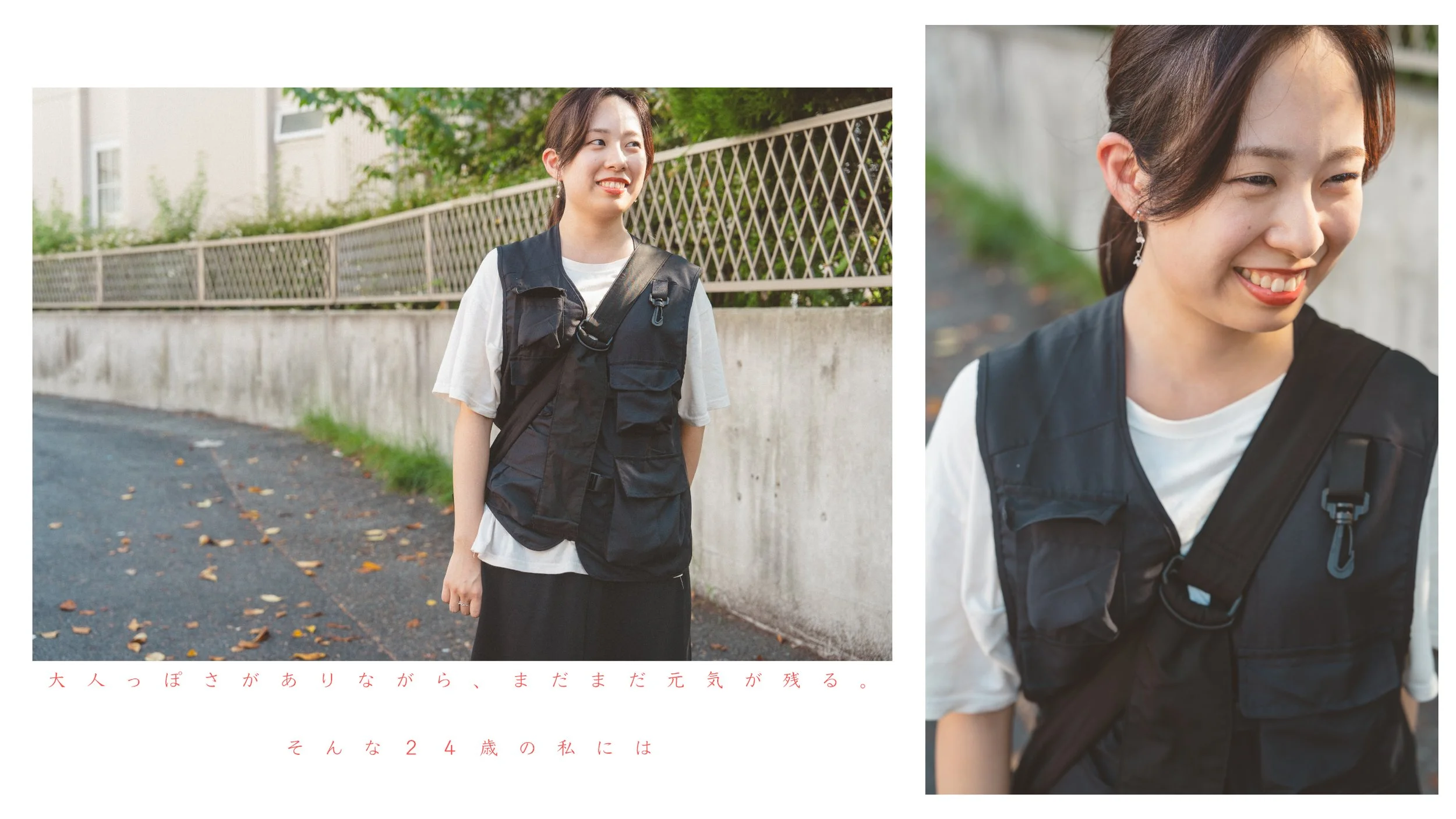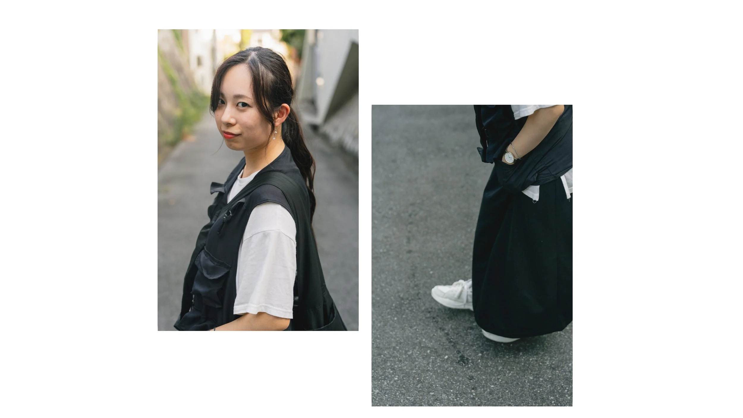 暗い背景に女性が立っている。彼女は白いTシャツに黒いベストを着ており、ショルダーバッグを持っている。