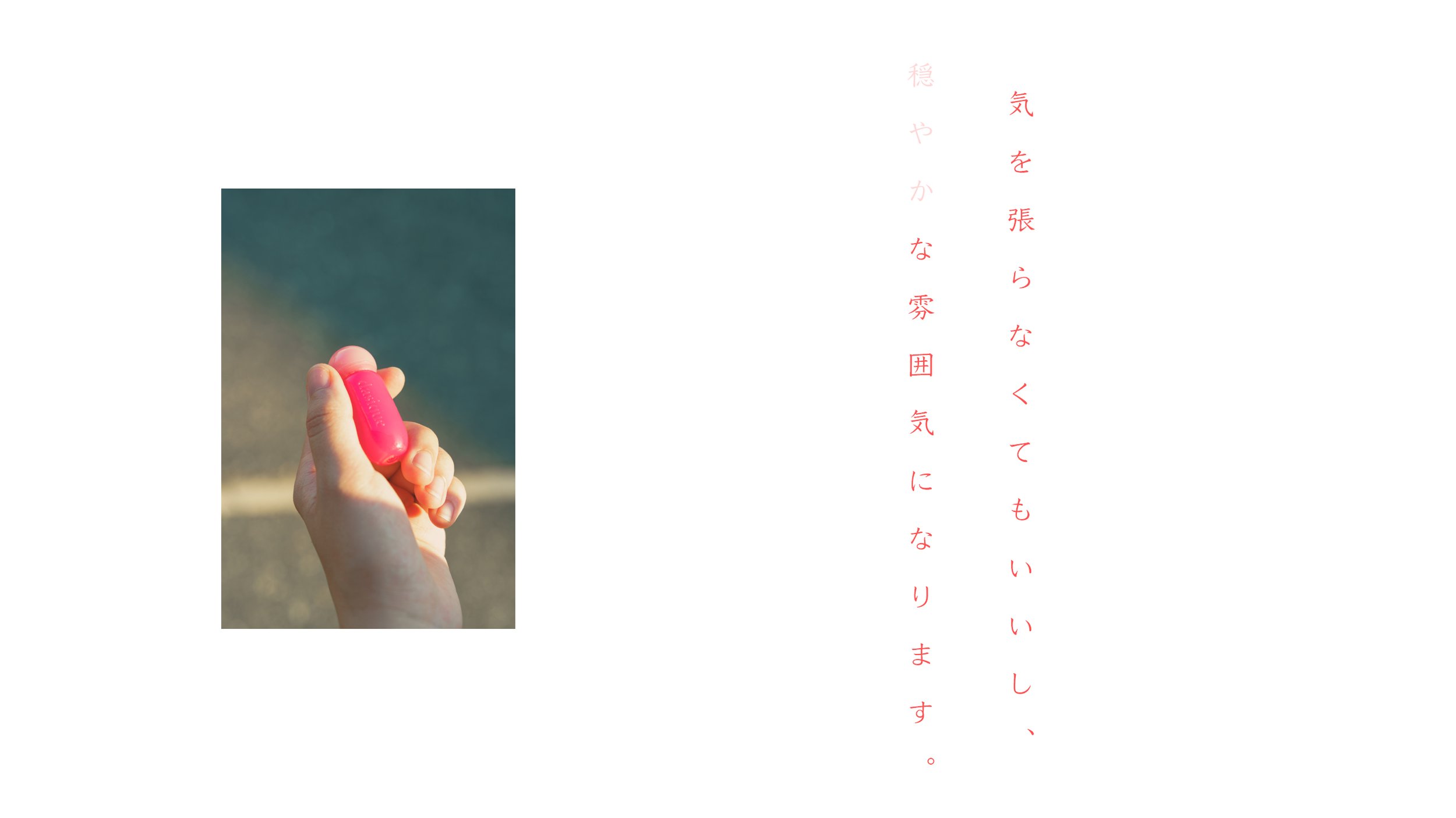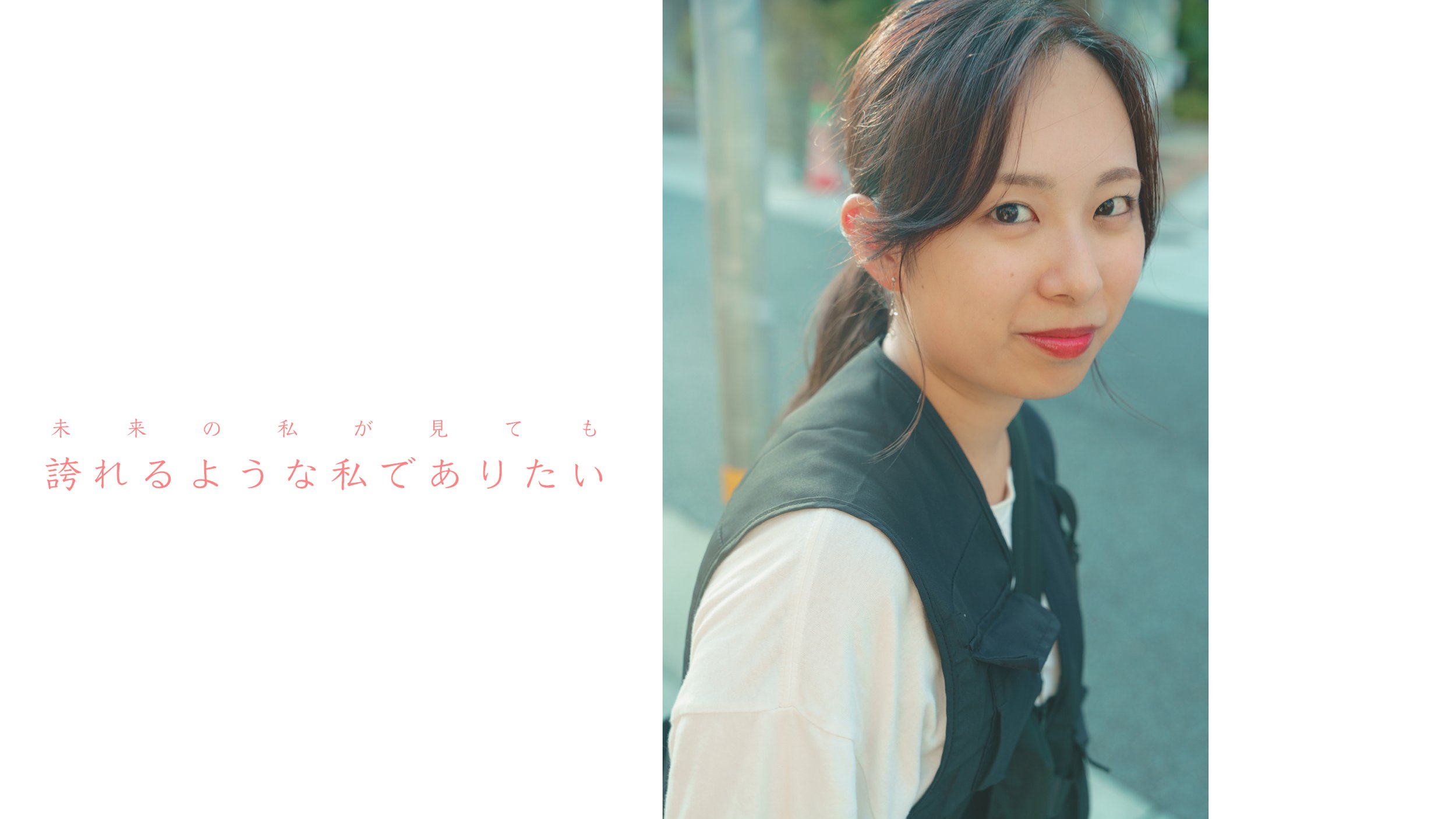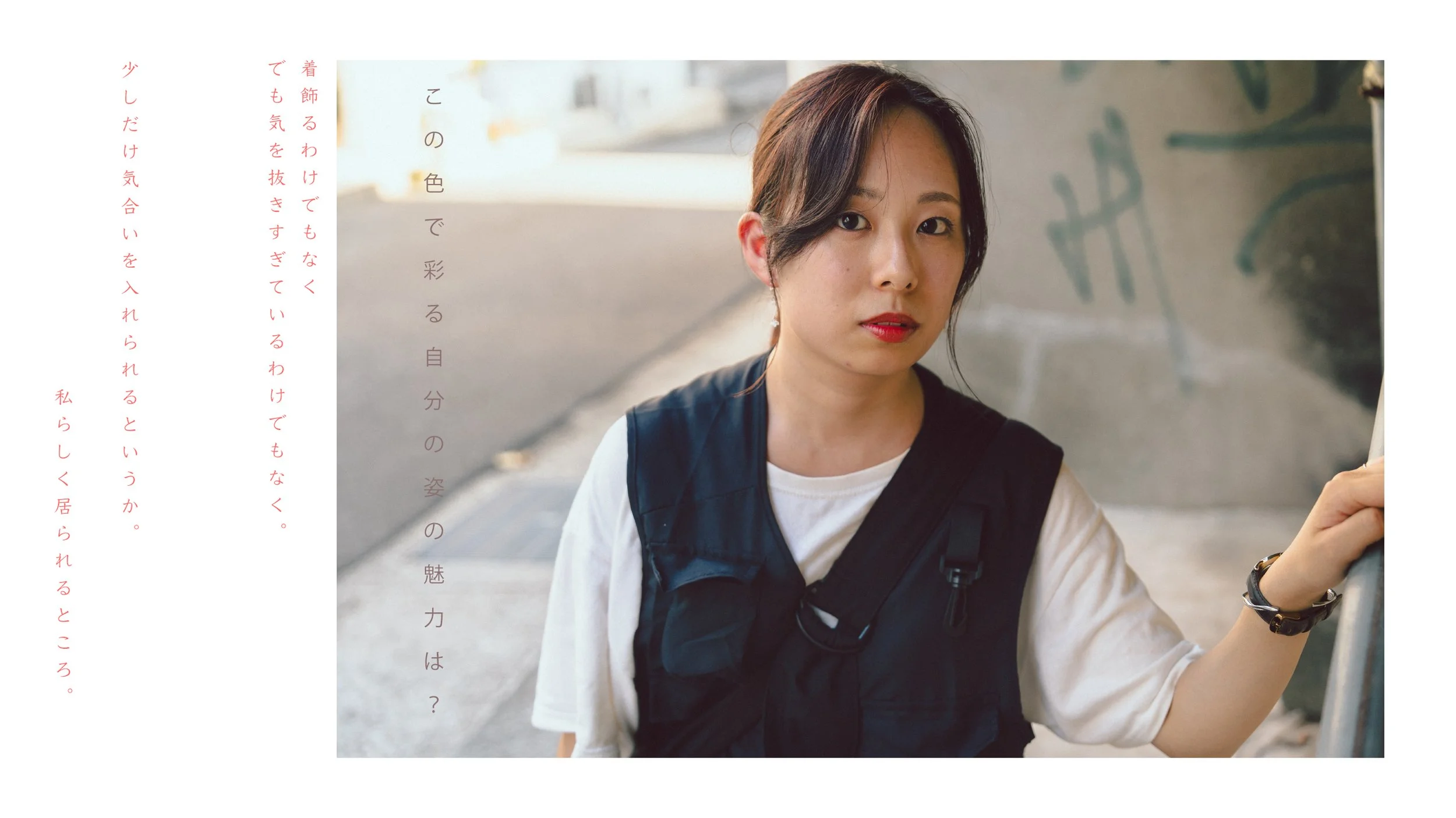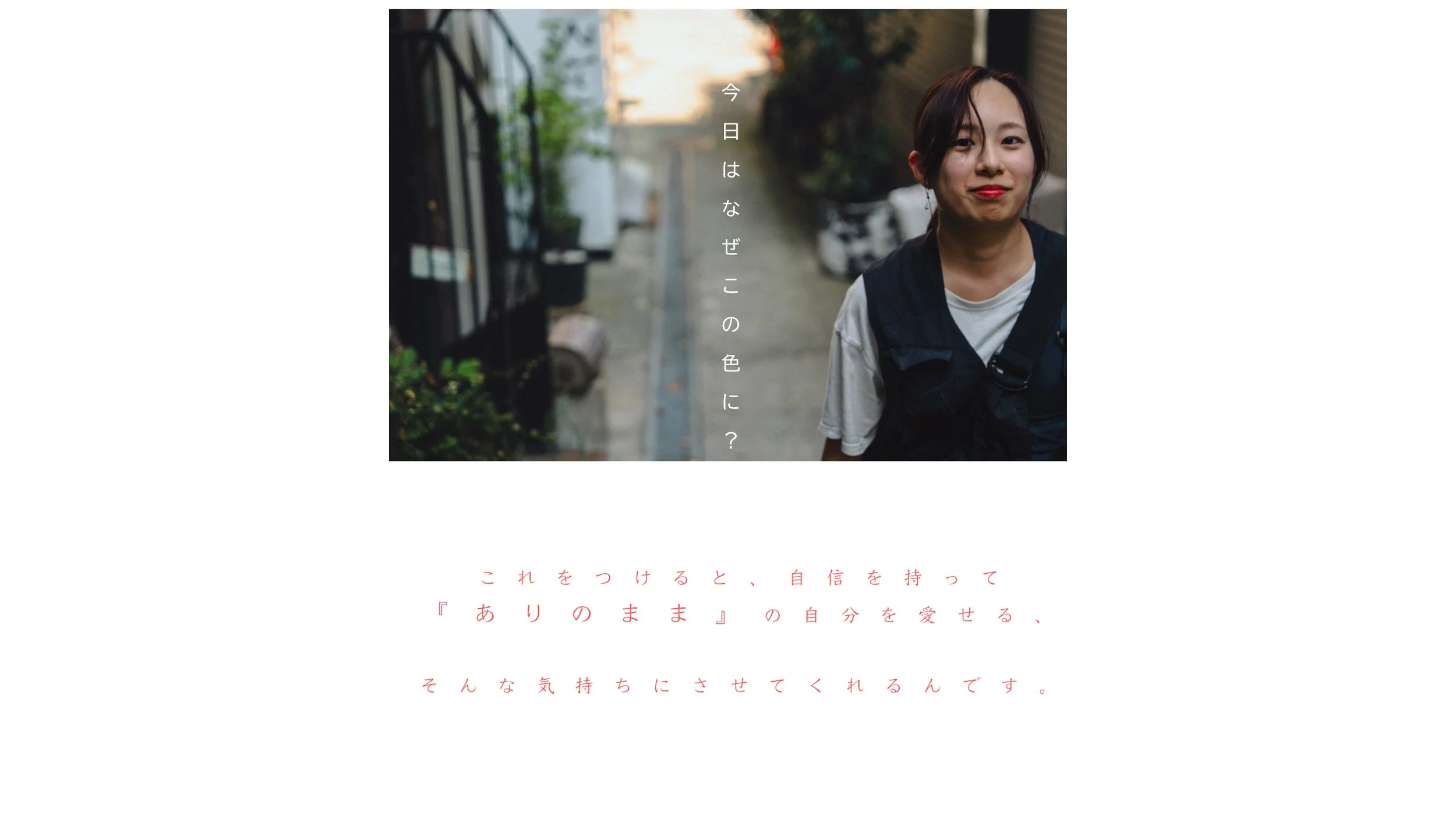 女性が笑顔で映る写真で、背景は狭い通路と家の外観。縦書きで「今日はなぜこの色に?」と書かれている。下部にはピンク色のテキストで説明文が書かれている。