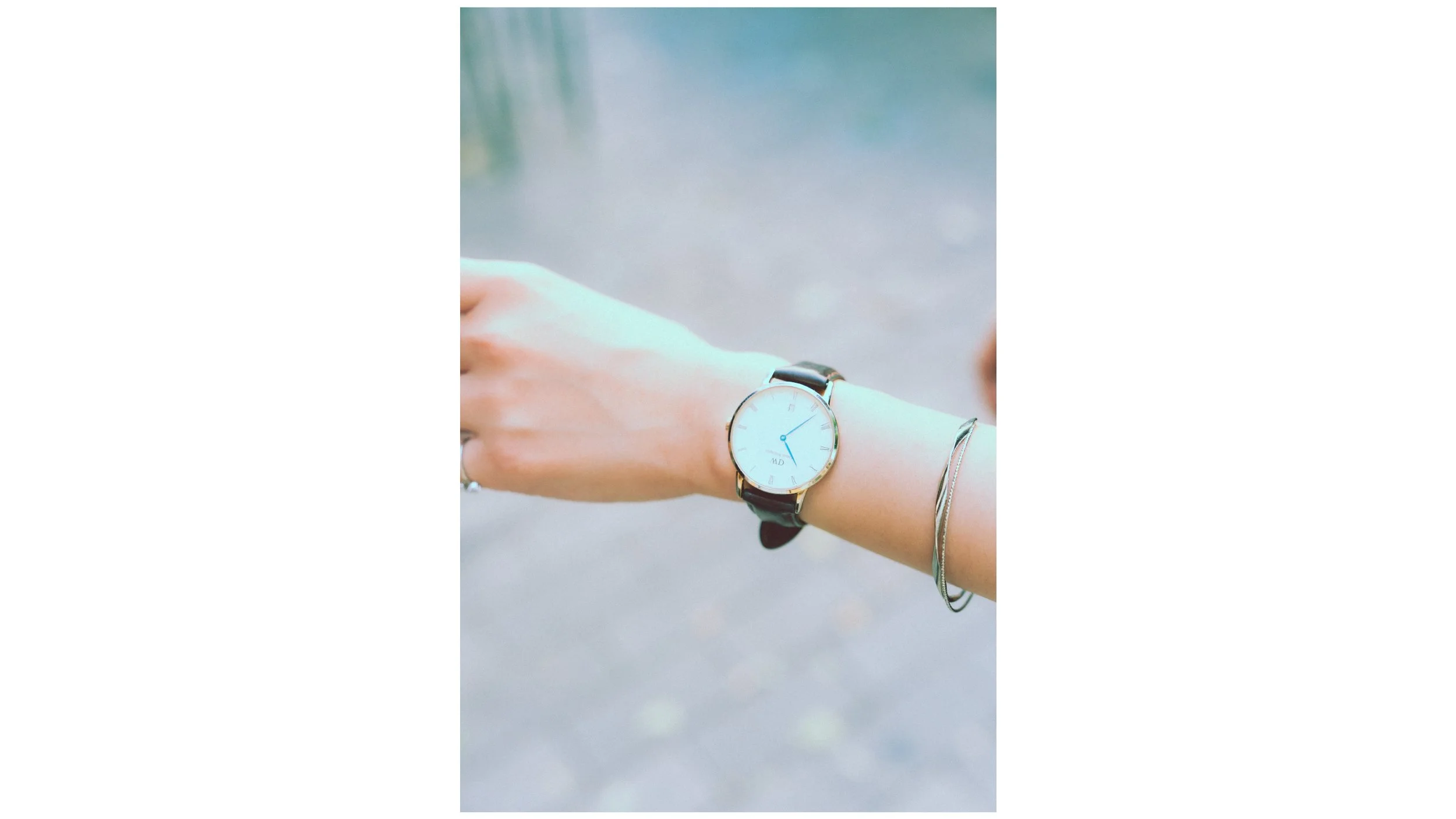 腕時計をつけた手が空を向いている。背景はぼやけた地面と水面のような風景。
