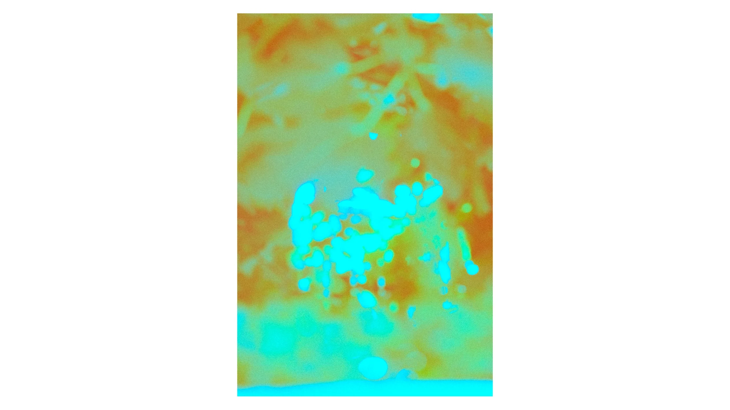 抽象的な色彩と形で構成された画像。青い点や線が散らばり、背景は暖色系のグラデーションで表現されている。
