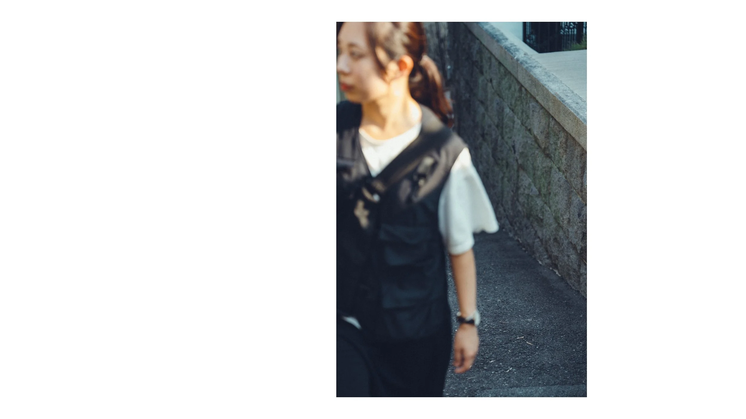 公園の歩道を歩く若い女性の写真。白いTシャツと黒いベストを着ている。